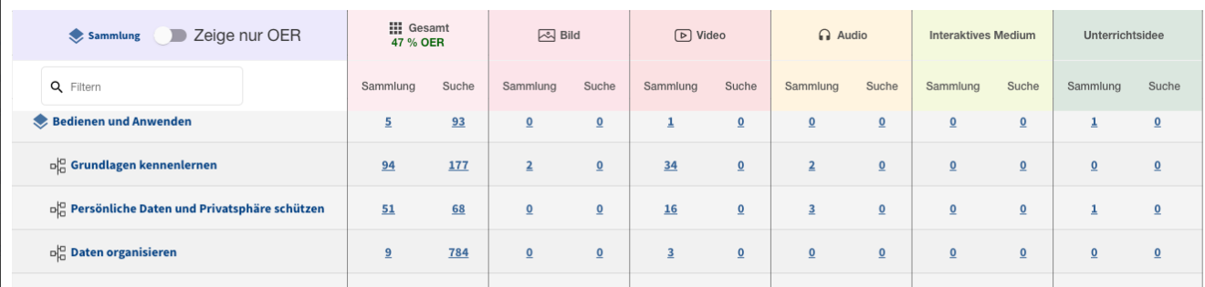 Die Tabelle zeigt die wichtigsten Inhaltstypen (Spalten). Zu jeden sollten mindestens 3-5 Inhalte in jeder Sammlung sein. Die Zeilen zeigen jeweils an, wie viele Materialien in der jeweiligen Sammlung liegen und dazu im Vergleich, wie viele Inhalte zu dem Themengebiet in der WLO-Suche verfügbar sind.