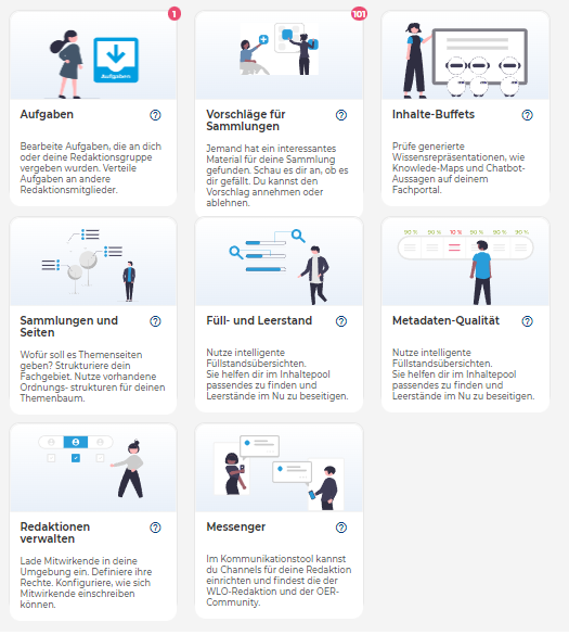 Alles Wichtige auf einem Blick. Das bietet dir deine Startseite. Von hier aus kannst du direkt alle Funktionen und Menüs ansteuern, die du zum Arbeiten als Fachredakteur*in benötigst. Außerdem wirst du informiert, wenn es neue Aufgaben für dich oder deine Redaktionsgruppe gibt oder Material für eine Sammlung vorgeschlagen wurde.